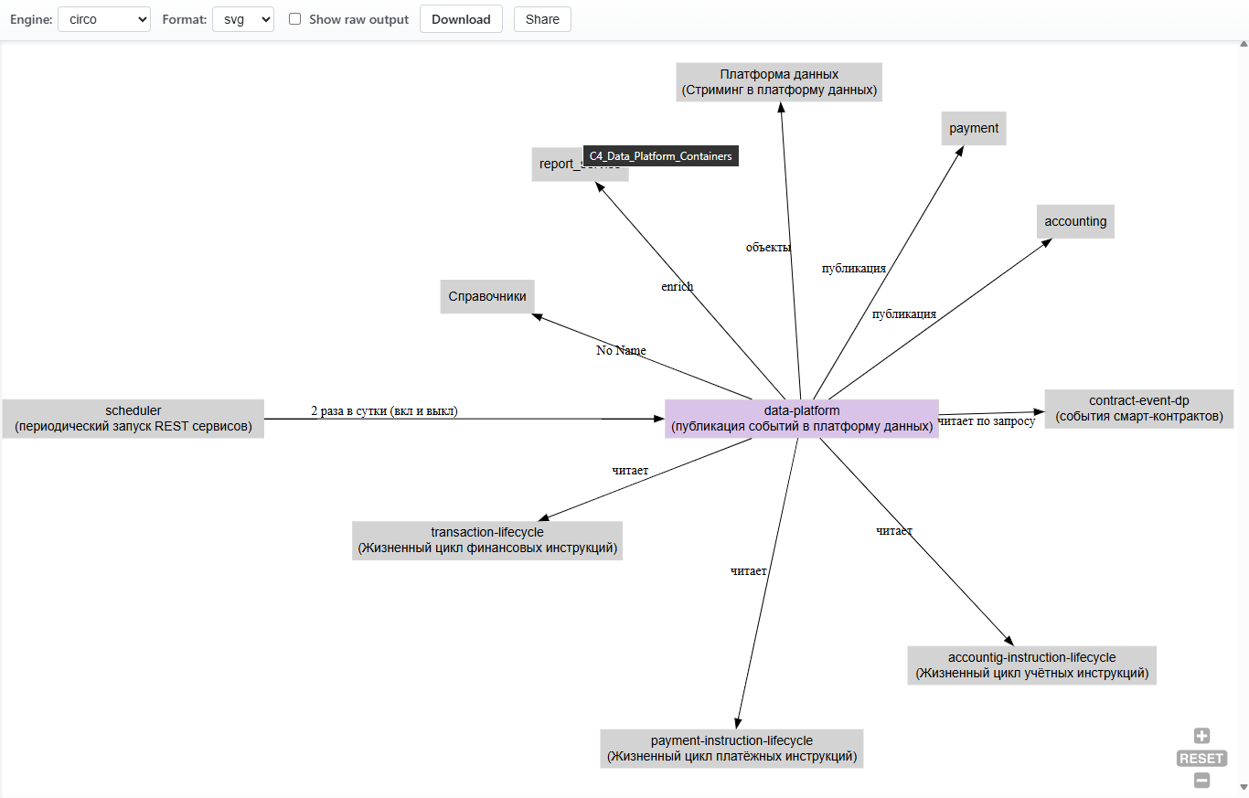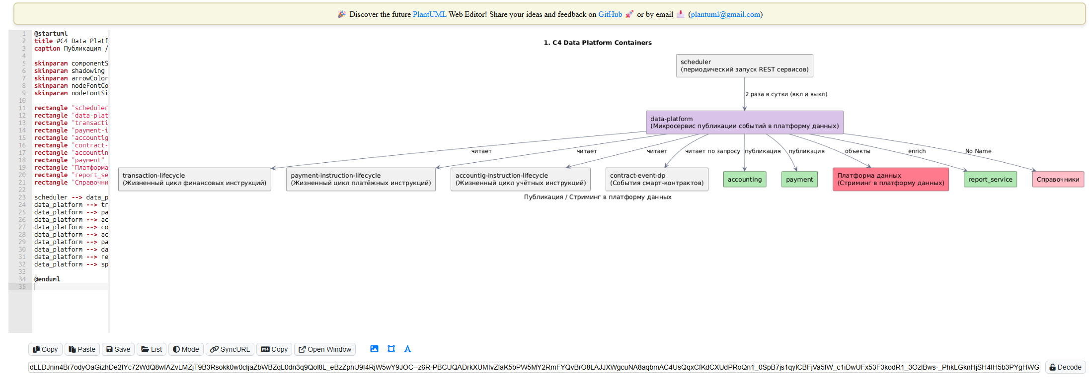 В рамках проектирования архитектуры Data Platform была создана диаграмма контейнеров (уровень C4), описывающая процесс публикации данных из сервисов предприятия в платформу данных.
