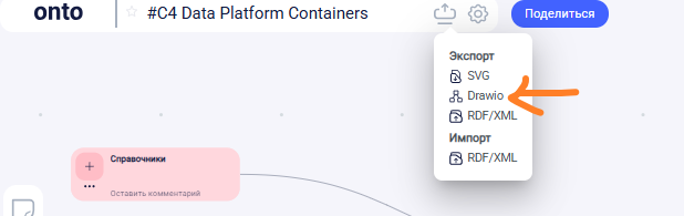 Экспорт в DrawIO можно выполнить напрямую из интерфейса Onto, так же как и в форматы SVG или RDF/XML.